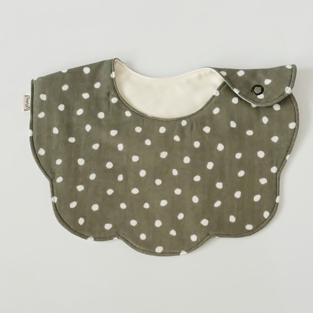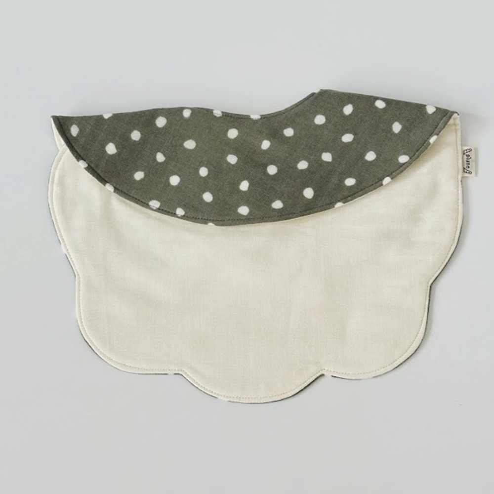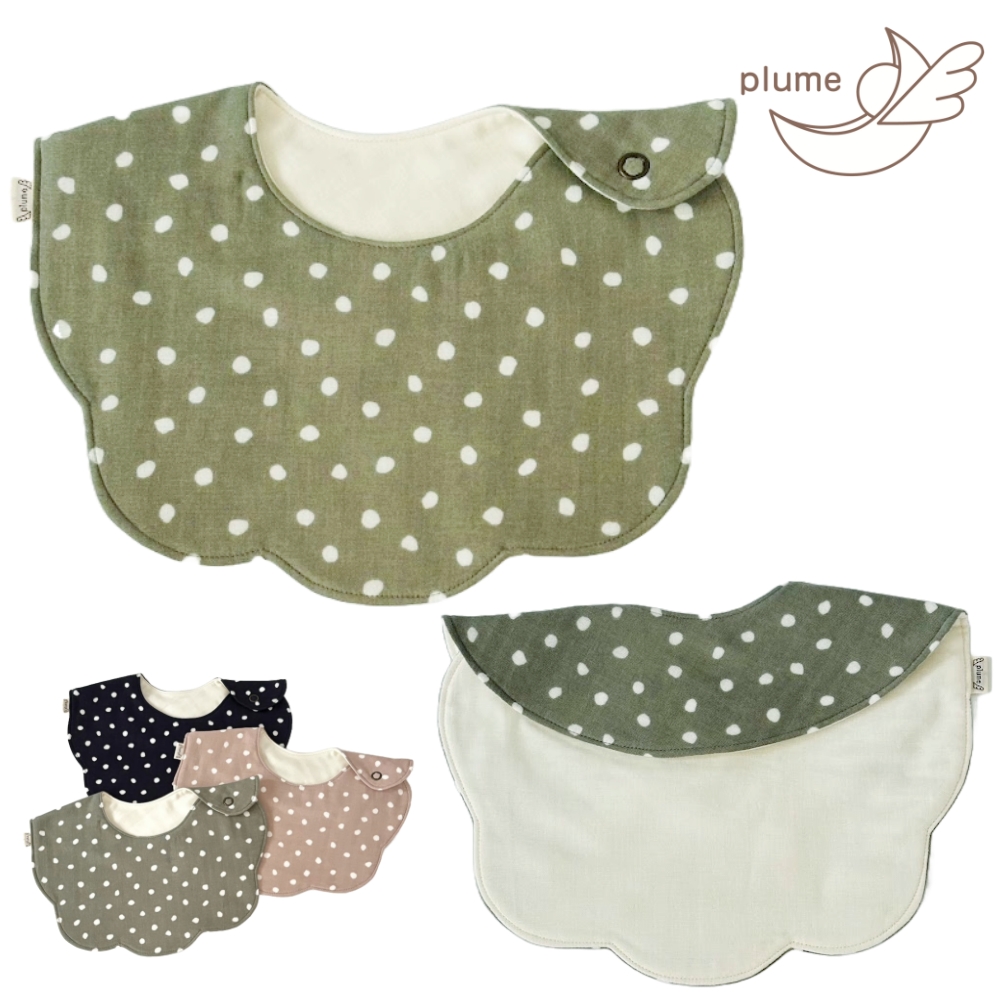 シンプルで使いやすいリバーシブルに仕上げました。イベントでは水玉3色シリーズの中で一番人気です。表も裏も使いたくなる、かわいい組合せのプルームスタイ。ぜひお試しください。